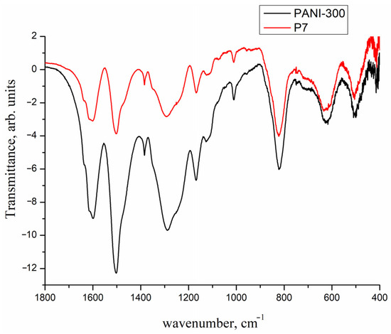 IR spectra of PANI-300 and P7 (the composite, formed upon Pd deposition on PANI-300 via the decomposition of Pd2(dba)3).