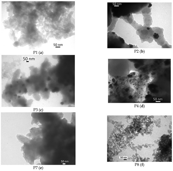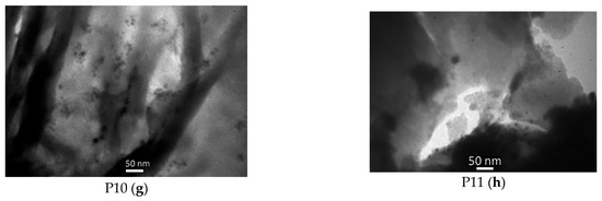 Sample P4, prepared via the decomposition of Pd2(dba)3, contains large dark particles, which do not have a regular shape, and many of them are transparent or semi-transparent (Figure 11d). Such particles can be considered as PANI with an increased Pd content; it seems that the deposition of Pd on PANI upon the decomposition of Pd2(dba)3 did not occur uniformly but preferentially on certain particles of the polymer, probably most suitable to Pd seeding. Dark spots that could be attributed to Pd nanoparticles were observed in the case of Pd deposition on PANI/C (P10) and PANI-H2SO4/C (P11) carriers (Figure 11g,h). The sizes of such particles did not exceed ca. 10 nm. Finally, the decomposition of Pd2(dba)3 in the presence of PANI-300 (P7) and PANI/SiO2 (P8) did not result in the formation of large Pd particles, which could be detected by TEM in our hands.