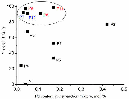 More interesting, a set of samples P6, P7 and P9–P11 showed a significantly higher performance (Figure 13; these samples are shown in a circle). These samples had the highest yields of THQ at relatively low Pd loadings in the reaction mixture, and these samples were characterized by the highest productivity parameter (n(THQ) per 1 mole of Pd, Table 1). For example, the productivity parameter for P7 was 2710, and for P9, it was 2285, while, for the P1–P5 set, the productivity parameter did not exceed 1272. This set of samples contains the composites, which were formed either on the basis of PANI doped by H2SO4 (P6, P9 and P11) or on the basis of Norit activated carbon (P10 and P11) or PANI after thermal treatment at 300 °C (P7). According to the results of the TEM studies, P10 and P11 contained Pd particles with sizes less than ca. 10 nm, and no large Pd particles could be found by TEM in P7, in contrast to P2, P3 and P4 from the previously described series. This observation is consistent with a well-known trend: an increase of Pd dispersion favors a higher catalytic performance [57]. It can be supposed that the higher performance of the samples from series P6, P7 and P9–P11 could be associated with a higher dispersion of Pd. In turn, such dispersion resulted from the specific conditions of Pd2(dba)3 decomposition; probably, these carriers favored the formation of a larger number of Pd nanoparticle growth centers compared to pure PANI and, as a consequence, smaller Pd nanoparticles.