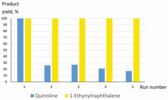 Sample P11 (10 g scale) was stable upon storage in ambient conditions in air for at least 6 months. The reusability of sample P11 (10 g scale) was checked in several repeated experiments on the hydrogenation of quinoline and 1-ethynylnaphthalene. The hydrogenation of these substrates was performed in the conditions as shown in Table 3; then, the catalyst was collected by filtration and used again for repeated hydrogenation. All procedures with the catalyst were carried out in air. The catalyst loss (by weight) was less than 10% in the first step and less than 5% in the consequent steps; the same filter from porous glass was used to minimize the catalyst losses. The quantity of substrate was respectively reduced in order to adjust it to the actual weight of the catalyst after each run. It was found that the yields of 1-ethylnaphthalene were 100% in five runs of hydrogenation (Figure 14). At the same time, the yield of 1,2,3,4-tetrahydroquinoline on the second run decreased to 26%, and then, it gradually decreased to 17% on the fifth run (Figure 14). Such a decrease could be associated with deactivation of the Pd active sites or Pd loss; in any case, this catalyst can find very limited applications for repeated use. On the other hand, it can be noted that the catalytic performance of P11 in the process of alkyne hydrogenation seemed to be “excessively high”, and after five runs, the performance of the catalyst (even if it decreased) was still sufficient to ensure complete hydrogenation of this substrate.