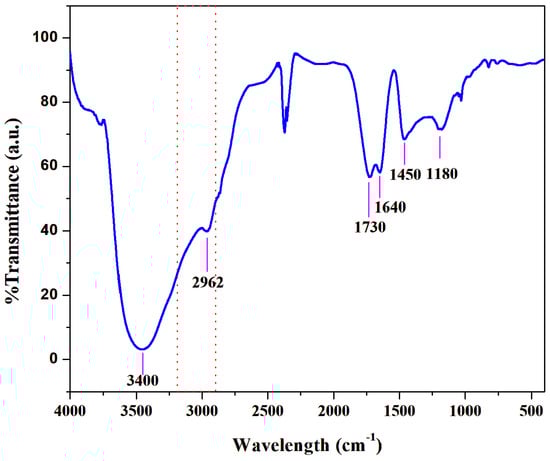 FT-IR spectroscopy of the copolyester revealed a distinct absorption peak at 1730 cm−1, which is indicative of ester C=O stretching, confirming the formation of the copolyester chain within the polymer matrix []. This observation is further supported by bands detected at 1180 cm−1, corresponding to C-O stretching vibrations. Additionally, a peak at 1640 cm−1 can be attributed to the C=C stretching vibration characteristic of itaconic acid []. A shoulder peak at 2962 cm−1 was assigned to the C–H stretching vibration of the methylene (–CH₂–) group present in itaconic acid, while the broad range between 2800 and 3100 cm−1 (dotted region) corresponded to both aliphatic and aromatic C–H vibrations []. Moreover, the peak at approximately 3400 cm−1 is associated with hydroxyl stretching vibrations. The peaks near 1450 cm−1 are linked to the -CH₂– bending vibrations of the methylene groups in the esters. Figure 1 shows the IR spectra of the synthesized copolyester.