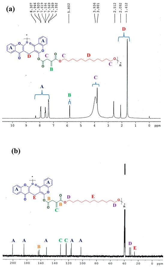 The 1H- and 13C-NMR spectra of the synthesized copolyester are shown in Figure 2. The 1H-NMR spectrum revealed alkene peaks around 5.8 ppm, which is consistent with previous findings []. The detection of an itaconic acid peak in the synthesized copolyester indicates that no cross-linking occurred during the polymerization process. Chemical shifts between 3.8 and 3.9 ppm were assigned to the O-CH₂ protons, while peaks at 2.1 ppm and 1.6 ppm corresponded to the methylene protons of dicoumarol and dodecanediol, respectively. Additionally, peaks observed between 7 and 8.3 ppm were attributed to the aromatic protons of dicoumarol []. In the 13C-NMR spectrum, peaks at approximately 33–34 ppm were linked to the terminal methylene carbon, while those near 25 ppm were assigned to the central methylene carbon. Distinctive peaks at 124 and 132 ppm indicate the presence of alkene carbons in itaconate, and the peak at approximately 165 ppm corresponds to the carbonyl carbons in itaconate. Aromatic carbon was identified at 102–210 ppm. These spectral observations provided valuable insights into the molecular structure and composition of the synthesized copolyester. The analysis also confirmed the incorporation of itaconic acid, dicoumarol, and 1,12-dodecanediol, with the molar ratio calculated from the NMR spectra of approximately 1:1:3, aligned with the expected composition based on the initial reactant ratios.