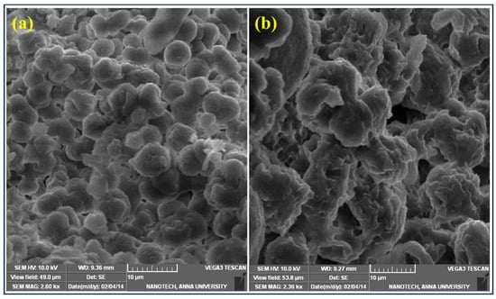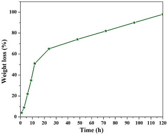 The surface morphology of the copolyester was analyzed using SEM before and after the degradation. Initially, the copolyester exhibited a smooth flower-like surface (Figure 4a). However, after 24 h of exposure to the phosphate buffer solution (pH 7.4), significant changes were observed. The surface became more irregular with an increase in the number of pits and cracks (Figure 4b). These irregularities intensified with prolonged exposure, indicating the susceptibility of the copolyester to degradation under physiological conditions. This degradation behavior suggests that the copolyester could be particularly useful in controlled drug delivery systems, where the rates of degradation and release can be precisely managed. To further quantify this degradation, GPC was performed on the samples after the degradation. The results showed a significant decrease in molecular weight, with the number-average molecular weight (Mn) dropping to 0.5 × 103 and the weight-average molecular weight (Mw) decreasing to 0.6 × 103. These findings confirm that the polymer chains break down during degradation, reinforcing the potential of these copolyesters for applications that require controlled degradation. The observed morphological changes provide valuable insights into the degradation process of the copolyester over time.