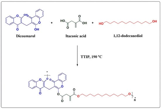 In this study, we synthesized a novel dicoumarol-based copolyester by reacting dicoumarol with itaconic acid and 1,12-dodecanediol using titanium tetraisopropoxide (TTIP) as a catalyst (Scheme 1). The first example of a dicoumarol-substituted copolyester was thoroughly characterized by FT-IR, NMR (1H and 13C), DSC, SEM, and biocompatibility studies.
