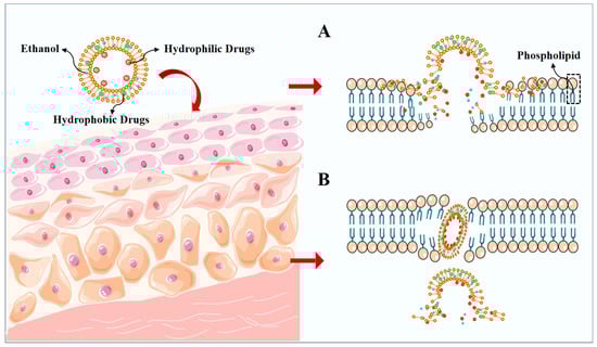 A schematic representation of the main permeation mechanisms of ethosomes. (A) ethanol effect, (B) ethosomes effect.