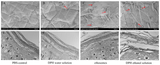 SEM and TEM of different formulation-treated skin samples. (A) SEM of skin-applicated PBS for 24 h. (B) SEM of skin-applicated DPH water solution for 24 h. (C) SEM of skin-applicated DPH ethosomes for 24 h. (D) SEM of skin-applicated 30% ethanol DPH solution for 24 h. (E) TEM of SC-applicated PBS for 24 h. (F) TEM of SC-applicated DPH water solution for 24 h. (G) TEM of SC-applicated DPH ethosomes for 24 h. (H) TEM of SC-applicated 30% ethanol DPH solution for 24 h. The pictures in the same column belong to the same group, and the red arrow represents SC exfoliation. (Reproduced with permission from reference [38]. Copyright 2019, Int J Pharm X).