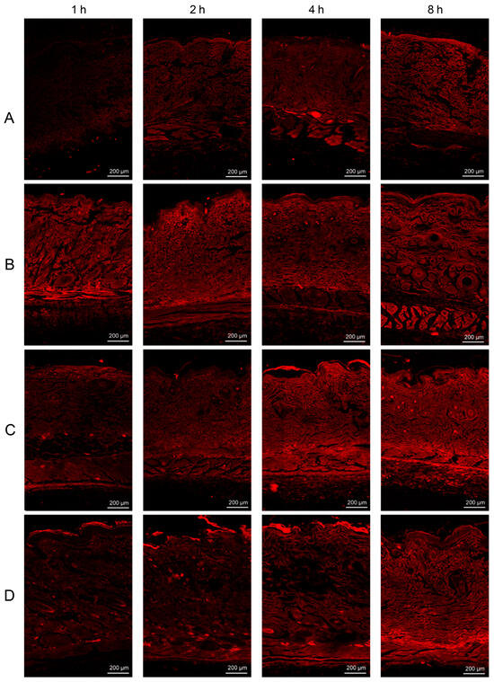 CLSM images of (A) plain RhB hydrogel, (B) RhB-L hydrogel, (C) RhB-E-30 hydrogel, and (D) RhB-T-SDC hydrogel at 1, 2, 4, and 8 h post in vivo application on dorsal rat skins. (Reproduced with permission from reference [53]. Copyright 2019, Int J Pharm).