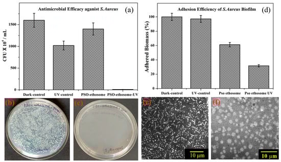(a) The antibacterial activity of PSO–ethosomes against S. aureus in the absence and presence of UVA. (b,c) Images of PSO–ethosome-treated S. aureus culture plates before and after UVA irradiation, respectively. (d) The adhesion efficiency of PSO–ethosome-treated S. aureus biofilms in the absence and presence UVA irradiation. SEM images of an S. aureus biofilm (e) without treatment and (f) treated with PSO–ethosomes followed by UVA illumination for 30 min. (Reproduced with permission from reference [86]. Copyright 2017, ACS Omega).
