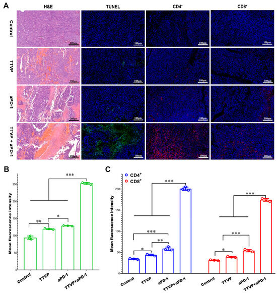Micrographs of tumor tissues stained by H&E, TUNEL, and antibodies of CD4/CD8. (A) Fluorescent intensity of (B) TUNEL and (C) CD4/CD8 staining (data are expressed as mean ± SD, n = 3; * p < 0.05, ** p < 0.01, *** p < 0.001). (Reproduced with permission from reference [105]. Copyright 2022, Acta Biomater).