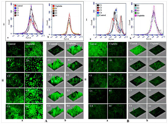 (A) (i) The flow cytometric analysis of in vitro ROS productions in A431 cells after treatment with (a) chitosan formulations; (b) ethosomal formulations using DCFH-DA dye in F1 filter. (ii) Fluorescence microscopy in (a) raw fluorescence images; (b) ImageJ software analyzed images; (B) (i) Mitochondrial membrane potential (Ψm) studies observed through the FL-1 filter using Rh 123 dye in (a) chitosan formulations; (b) ethosomal formulations. (ii) Fluorescence microscopy images of using Rh 123 dye in (a) raw fluorescence images; (b) ImageJ software analyzed images. (Reproduced with permission from reference [106]. Copyright 2021, Int J Pharm).
