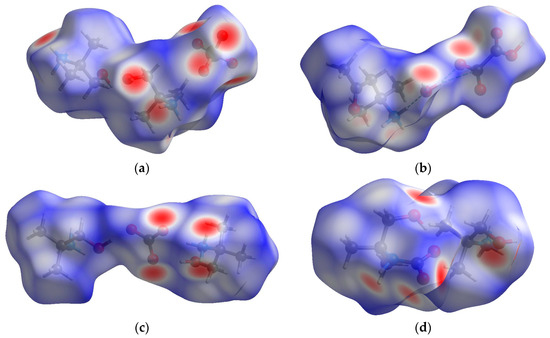 Hirschfeld surface for the compounds (view along a-axis): (a) 1; (b) 2; (c) 3 [11]; (d) 4 [12].