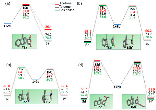 Energy schemes (kJ/mol) for reactions of 1 with 2a–d, as shown in panels (a–d), calculated at the M06-2X/6-311+G(d,p)//M06-2X/6-31+G(d) level of theory.
