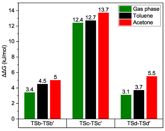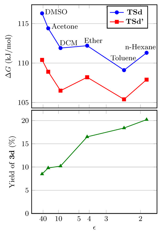 For theoretical evaluation of the solvent effects on the yield of 3d and 3d’, we have determined it in five different solvents with different dielectric constants, i.e., DMSO (dimethylsulfoxide), acetone, DCM (dichloromethane), diethyl ether, toluene and n-hexane. The results are presented in Figure 2. The qualitative effect of all solvents is the same, i.e., increased free energy of activation when compared to the gas phase, as presented above. This overall effect may be because reactants have a higher accessible surface, and hence their stabilization by solvents is greater than that of the products. Crucially, solvation not only raises the barrier heights, but it also raises the difference in barrier heights. In the gas phase, the for the two reaction pathways is only 3.1 kJ/mol, which corresponds to a product distribution of 78:22 according to standard Boltzmann statistics. The selectivity is slightly improved in toluene ( kJ/mol) to 82:18, while acetone gives ( kJ/mol) a significant further improvement to 90:10 (Figure 3). In DMSO solvent, which has a higher dielectric constant than acetone, this selectivity is enhanced to 91.5:8.5. Figure 2 highlights a roughly linear relationship between the inverse of the dielectric constant and the yield of the side product 3d. Conversely, more erratic behaviour and no clear trends are observed for the overall barrier heights. In summary, the results highlight that the yield of the side product 3d is reduced by more than half when changing the solvent from n-hexane to acetone or DMSO.