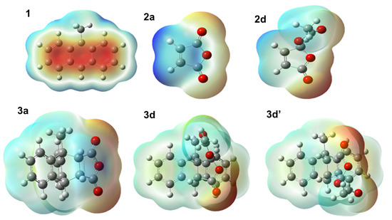 Next, we were interested in rationalising the results via molecular electrostatic potential (MESP) analysis. MESP analysis provides an efficient way of analysing distinct regions in molecules. It helps in understanding the effect of structural modifications of molecules on their reactivities [67]. It displays the distribution of electron density and indicates the sites suitable for the attack of nucleophiles and electrophiles [58]. MESP analysis for the reactants and products has been carried out and Figure 4 displays these maps. The blue and red colours in these plots indicate the regions of highest and lowest electrostatic potential, respectively. Higher electrostatic potential corresponds to a lower density of electrons, while a more negative value of electrostatic potential indicates an abundance of electrons. Intermediate values of electrostatic potential are represented by light-blue, yellow and green colours, depicting marginally electron-deficient, slightly electron-rich and neutral sites of molecules, respectively [68]. In DA reactions, the electron density is transferred from the diene to the dienophile; therefore, reactant 1 (diene) should behave like a nucleophile while the reactants 2a and 2d (dienophiles) must act as an electrophile. An examination of Figure 4 clearly reveals that carbon atoms of the diene have a higher electron density than the carbon atoms of dienophiles. If the relative electrostatic potential of the two dienophiles (2a and 2d) is compared, then it can be noticed that 2a has a comparatively greater value around its CC double bond. It means that 2a is a better electrophile as compared to 2d and this is consistent with the fact that the activation free energy for the reaction of 1 and 2a is smaller than that of the reactions between 1 and 2d. The MESP of products indicates that the blue regions of dienophiles and red regions of the diene have turned green. It verifies that electron density has been transferred from the diene to the dienophiles and the molecules have become less polar overall.