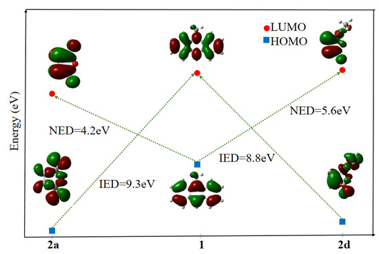 In toluene and acetone, the HOMO of the diene is slightly reduced, while the LUMO of both dienophiles is somewhat increased in terms of energy compared to the gas phase. Despite this individual change in energies, their relative energies remain in the same order in both solvents as in the gas phase (a figure for FMO interactions in toluene and acetone is provided in Supplementary Information, i.e., Figure S5). The LUMO energy is lower for 2a than for 2d facilitating the reaction, in agreement with the trend in activation energies. The difference in the energies of these frontier molecular orbitals (FMOs) is an indicator of the kinetic stability of molecules. A higher energy gap corresponds to greater kinetic stability, and vice versa for a lower gap [71]. The kinetic stability of TSd is higher than that of the TSd’ (as indicated in Table S2), and hence later has greater ease of transition [72]. Depending upon the relative FMO energies of the diene and dienophile, the Diels–Alder reaction may proceed via normal electron demand (NED) or inverse electron demand (IED) [73]. In Figure 4, the interactions of the frontier orbitals of the reactants are represented in the gas phase. It shows that the studied reactions follow the normal electron demand pathway as the difference between the HOMO (diene) and the LUMO (dienophile) is smaller than the energy gap between the HOMO (dienophile) and the LUMO (diene) [74]. In toluene and acetone, these reactions still have normal electron demand; however, the value of the IED and NED gaps is changed slightly. For 1+2a, the NED is increased from 4.2 eV in the gas phase to 4.3 eV and 4.5 eV in toluene and acetone, respectively, while, for 1+2d, it is same in the gas phase and toluene and increased by 0.1 eV in acetone. The IED for them is reduced from 8.8 eV in the gas phase to 8.7 eV in toluene and 8.6 eV in acetone.