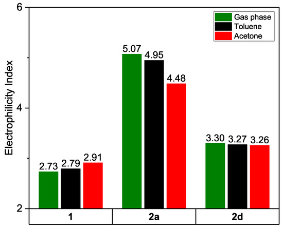 The energies of frontier molecular orbitals can be used to determine global reactivity descriptors, including chemical hardness and softness, chemical potential and the nucleophilicity index and electrophilicity index. Equations (1)–(5), provided in the computational details section, are used for the calculations of GRI. Global hardness estimates the extent to which charge transfer is prohibited in a molecule; conversely, global softness measures the electron-accepting ability of a molecule. The electrophilicity index calculated from the chemical hardness and chemical potential helps in determining the strength of the electrophile; the molecule may be a strong electrophile ( > 1.5 eV), marginal electrophile ( < 0.8 eV) or moderate electrophile (1.5 eV > > 0.8 eV). A smaller value of indicates a poor electrophile but a better nucleophile and vice versa [75,76,77,78]. Figure 6 indicates that 1 is a poorer electrophile as compared to the dienophiles, and, among the two dienophiles, 2a clearly outperforms 2d. This figure also shows that the solvents decreased the electrophilic character of the dienophiles but raised it for the diene, and the effect of acetone is more pronounced than that of toluene. From Table S2, it can be inferred that, among the reacting molecules, the dienophiles are better electrophiles than the diene. It also indicates that the softness of the dienophiles is decreased in solvents, and, as the role of the dienophile is to accept the electrons in the DA reaction, a decrease in its softness causes the reaction to proceed at a lower rate. A comparison of chemical potential indicates that the charge will be transferred from electron-rich species 1 to electron-deficient species (2a and 2d) [63]. The nucleophilicity index of 1 shows that it is a strong nucleophile (N > 3 eV), while 2a and 2d (N < 2 eV) are very weak nucleophiles [79]. As the diene in the DA reaction behaves as a nucleophile and the dienophile as an electrophile, the higher N of 1 and larger of 2a and 2d are favourable factors for these reactions.