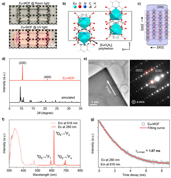 The optical properties of Eu-MOF were then systematically investigated. As shown in Figure S6, UV-Vis diffuse reflectance spectroscopy reveals that Eu-MOF strongly absorbs in the UV region, with a band gap energy of 3.80 eV determined from the Tauc plot. As depicted in Figure 1f, an extensive band spanning from 300 to 400 nm is evident in the excitation spectra of Eu-MOF. Upon excitation at 280 nm, the Eu-MOF exhibits three characteristic emission bands at 594 nm, 616 nm, and 695 nm, corresponding to the 5D0→7F1, 5D0→7F2 and 5D0→7F4 transitions, respectively. These characteristic luminescence properties of Eu originate from the shielding effect of the 4f electron layer [28,29,30,31,32,33]. Among these peaks, the emission at 616 nm is the most intense one that causes the red emission by Eu-MOF. The distinct luminescent properties of Eu-MOF are further corroborated by luminescence lifetime measurements and temperature-dependent photoluminescence tests. As shown in Figure 1g, the fitted luminescence lifetime of Eu-MOF is 1.87 ms, which is consistent with the forbidden nature of the 4f-4f electronic transitions, which typically results in long-lived excited states. Moreover, within the temperature range of 80–300 K, there is no significant shift in the emission peaks of Eu-MOF crystals. This stability is attributed to the inner-shell nature of the 4f electron orbitals, rendering them less sensitive to thermal perturbations (Figure S7).