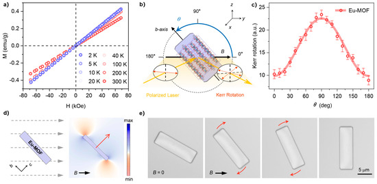 Magnetic hysteresis (M-H) loops were measured over the temperature range of 2–298 K to investigate the magnetic properties of Eu-MOF. As shown in Figure 2a, Eu-MOF exhibits typical paramagnetic behavior, with its magnetization (M) increasing linearly with the applied magnetic field (H) up to 7 T at room temperature. Notably, as the temperature decreases from 298 K to 2 K, no magnetic hysteresis is observed in the M-H loops of Eu-MOF, indicating that there are no magnetic interactions between the neighboring Eu-ions [34]. To further assess the magnetic anisotropy of Eu-MOF, angle-resolved magneto-optical Kerr effect (MOKE) measurements were conducted [35]. As shown in Figure 2b, a single Eu-MOF microcrystal was placed in a uniaxial magnetic field, and the polarized laser reflected from it would generate a rotation of the polarization plane, namely, Kerr rotation. The intensity of the Kerr rotation is proportional to the magnetization along the field direction, i.e., the maximum Kerr rotation will be obtained when the crystal possesses the maximum magnetic susceptibility χmax. Therefore, by rotating the Eu-MOF crystals, their magnetic anisotropy can be reflected in the angle-dependent Kerr rotations. As shown in Figure 2c, the maximum Kerr rotation occurs at 90°, indicating that the χmax of Eu-MOF aligns along the crystallographic c-axes, underscoring the anisotropic magnetic behavior of the material.