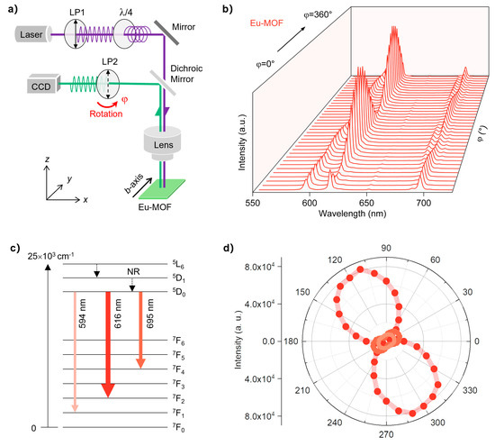 Considering that Eu-MOFs possess a regular crystal shape, highly ordered crystal structure, and characteristic luminescence originating from the 4f–4f electronic transitions, their luminescence should be polarized [9,11]. We further investigated the DOP of Eu-MOF via a conventional reflective imaging system. As shown in Figure 3a, a polarized 375 nm continuous wave laser was used as the pumping source, which initially passes through a polarizer to purify the polarization state and further passes through a quarter-wave plate to become circularly polarized. Therefore, the excitation light reaching the Eu-MOF through a microscope objective is isotropic. The emission signals are collected by the spectrometer after passing through a polarizer (LP2), which can be rotated counterclockwise to record the polarization characteristics of Eu-MOF luminescence. Note that the Eu-MOF crystal is fixed with its b-axis parallel to the y-axis, and the polarization direction of LP2 is parallel to the z axis at φ = 0°. As shown in Figure 3b, the luminescence intensities of Eu-MOF change dramatically when the LP2 rotates from 0° to 360°, suggesting a high DOP. Notably, the intensity of each emission peak exhibits a periodic variation with a period of 180°. Simultaneously, the intensities of different emission peaks tend to change reciprocally, with some peaks intensifying while others diminish.