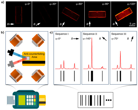 (a) Sequences of the fluorescence microscopy images of Eu-MOF microcrystals showing the changes in their luminescence intensities during the continuous magnetic orientation response; (b) schematic diagram of the internal structure of the card reader. The anti-counterfeiting area is placed at the center of the Helmholtz coils and the polarization spectra are read after the magnetic field is applied; (c) illustration of the encoding strategy. A barcode is obtained by combining a series of spectral data under different magnetic field directions.