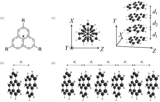 First, we optimized the geometry of monomer 1a at the UB3LYP/6-31G* level under the constraint of D3h symmetry, the same level as the previous studies [,]. Then, we constructed the anti-type π-stacked N-mer models (N = 2, 4, and 6) consisting of 1a with different stacking distances d1 (2.8 Å ≤ d1 ≤ 4.0 Å, see Figure 1b), maintaining each monomer geometry frozen. For tetramer (N = 4), we also investigated the effects of stacking distance alternation between d1 and d2, shown in Figure 1c, by changing the ratio for SDA, d2/d1, from 1.0 to 2.0. We name the N-mer model with the ratio d2/d1 1aN(d2/d1) for simplicity.
