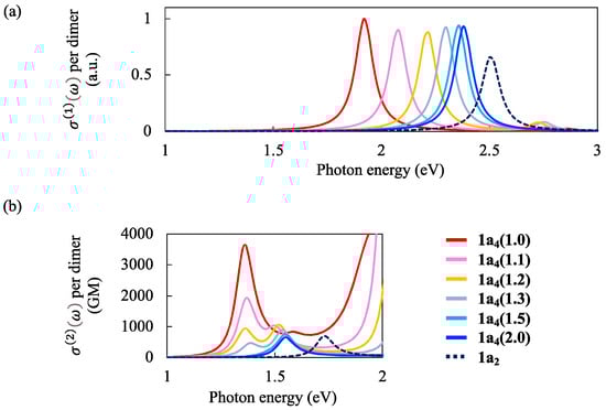For the TPA spectra, only a single peak appeared at ~1.7 eV for 1a2 because of the limited active space size [CAS(2,2)]. For the tetramer models 1a4(d2/d1), enhanced TPA cross-section values (per dimer) were obtained as the incident photon energy approached the excitation energy of the OPA band. This is because both the one-photon and two-photon resonance conditions were nearly satisfied in this region [,]. However, the present level of approximation for the excited state calculations would not sufficiently describe the higher-lying excited states concerning the TPA transitions in this region. In the lower-energy region of incident photon energy (<1.7 eV), we obtained a single TPA peak at ~1.6 eV for 1a4(2.0) and 1a4(1.5). As the d2/d1 decreased, this peak position was red-shifted, and another peak appeared at ~1.4 eV. The intensity of the lower-energy peak at ~1.4 eV increased drastically as the d2/d1 approached one.