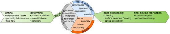 The development of new microfluidic devices by additive manufacturing requires various design considerations. First, the requirements and necessary performance of the device need to be clarified. Design parameters such as the geometry and the dimensions of the device need to be defined to achieve the desired fluid flow. In addition, the capabilities of the existing printer, the desired material, and the laboratory peripherals must be determined. With this information, the design process starts, where the aim is to develop a first printable CAD model. The design then goes through an iterative process consisting of testing and validation, review, and prototyping to increase the device’s quality and performance. Further post-processing that deals with cleaning, surface treatments or coatings, and enhancing optical transparency is needed to enable the device’s actual applicability. With all these considerations, the device is ready for final true-to-size fabrication and performance optimization. Figure 1 provides an overview of the development process for additively manufactured microfluidic devices. The process is examined in more detail in the following subchapters.