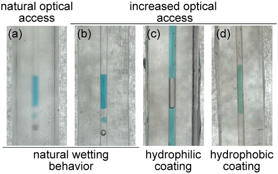 Vice versa, in the case that the aqueous phase is desired to be the wetting phase, a different treatment is necessary to establish a hydrophilic coating of the resin. A liquid-phase coating is also desired here to handle closed channels [55]. The effect of the treatment is emphasized in Figure 5d. The protocol for hydrophilic surface coating is as follows:
