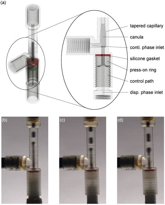 The adjustable co-flow device is a modular setup that consists essentially of a capillary and a cannula that are both 3D-printed. The setup and a close-up can be seen in Figure 6a. Right at the t-junction of the co-flow setup, the capillary features a diameter of = 2.5 mm that tapers over a distance of 5 mm until a diameter of = 1.8 mm is reached. A thread is used to adjust how far the tip of the cannula, where the droplet formation happens, protrudes into the capillary. As the geometry and dimensions of the capillary have a significant influence on droplet formation, this design can be used to control the entire process without the need to change any process equipment or fluid flows. The cannula has an inner diameter of = 1 mm and an outer diameter of = 1.4 mm. The length of the part of the cannula that penetrates the capillary can be varied from = 4.5–9.5 mm to match the tapered distance of the capillary. To ensure a leakage-free process, a silicon gasket is pressed onto the channel, which is used to insert the cannula into the capillary and is punctuated by the cannula. A 3D-printed press-on ring that features a thread and a hole for the cannula is used for this purpose. The thread behind determines the stroke distance and hence the control path of the cannula. The design and dimensions of the device are given in Appendix A.