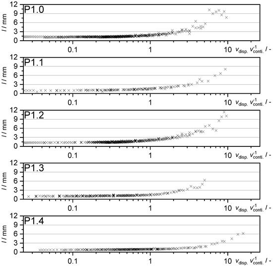 These geometrical influences are emphasized in Figure 7, where for each prototype the droplet, slug length l is plotted over the phase velocity ratio . With an increasing phase velocity ratio, a transition from droplet flow to slug flow can be observed. While there is only a small effect of the orifice opening angle, the steeper slope for P1.2 shows that a smaller inlet channel of the dispersed phase promotes slug formation. The exact opposite effect can be seen for P1.3 and P1.4, where the slope of the graph is much flatter and droplets are generated over a wide range of phase velocity ratios.