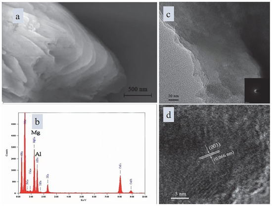 (a) SEM images, (b) EDS, (c) TEM, and (d) HRTEM of OSA-LDH sample synthesized at 80 °C.