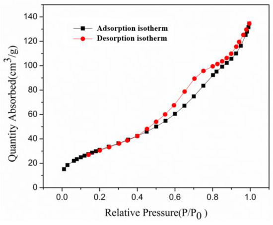 In this experiment, BET analysis was used to analyze and test the specific surface area and pore characteristics of the sample. Figure 3 shows the adsorption and desorption isotherms of the OSA-LDH prepared for the BET test.