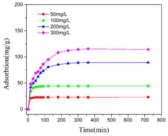 The initial concentration of pollutants has obvious influence on the adsorption effect of the adsorbent. The Pb2+ initial concentration of the reaction was set as 50 mg·L−1, 100 mg·L−1, 200 mg·L−1, and 300 mg·L−1, respectively; the dosage of the OSA-LDH adsorbent was 2.0 g·L−1; the reaction temperature was 25 °C; the pH was 5.5; and during the whole reaction process, it was continuously shaken to ensure a full reaction. The results of the adsorption removal rate and time are shown in Figure 6.