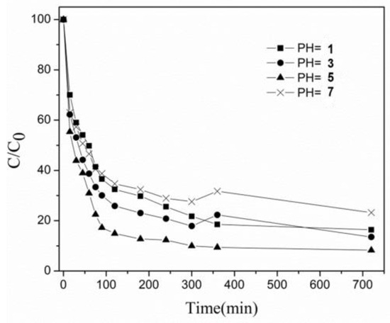 The removal efficiencies of Pb2+ by OSA-LDH at different pH (1, 3, 5, and 7) are shown in Figure 7. With the pH value of the solution increasing from 1.0 to 5.0, the equilibrium adsorption capacity also increased. However, when the pH of the solution was adjusted to 7.0, the adsorption capacity decreased. At a lower pH value, H+ in the solution, which was very high, was in competition with a positive charge of Pb2+. As a result, the adsorption capacity was reduced. In addition, in lower-pH solutions, more hydroxyl groups on the surface of OSA-LDH were protonated, the surface was positively charged, and there was a repulsive force between OSA-LDH and Pb2+, which was not conducive to the adsorption of positively charged Pb2+, resulting in a smaller adsorption capacity. At higher pH values, due to the increased Pb(OH)2 in the solution, and there was little Pb2+; thereby, the adsorption capacity was reduced.