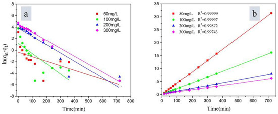 (a) Pseudo-first-order kinetic model curves and (b) pseudo-second-order kinetic model curves at different initial concentrations of Pb2+.