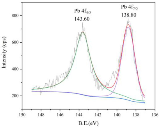 To better explain the chemical environment of the adsorbed Pb2+, the XPS spectra of Pb 4f were also investigated. As shown in Figure 10, the characteristic peaks of Pb 4f appeared at 138.8 eV for Pb 4f7/2 and at 143.6 eV for Pb 4f5/2, indicating the formation of complexations such as Sur-OH-Pb2+, Sur-O-Pb2+, or Sur-COO-Pb2+. Therefore, it can be inferred that the surface of OSA-LDH has some hydroxyl groups as functional groups that can react with Pb2+ by chemical binding to form inner-sphere complexes. Meanwhile, there were some deprotonated hydroxyl groups (Sur-O−) that may have formed outer-sphere complexes with Pb2+ through electrostatic binding reaction. The adsorption of Pb2+ by OSA-LDH can be expressed as follows [29,30]:
