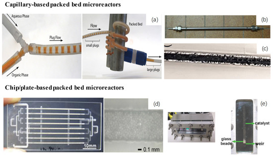 The packed bed microreactor can be either capillary- or chip-based (Figure 1). The capillary-based microreactor utilizes readily available and inexpensive capillaries made from materials such as polymers, silica, or stainless steel. The chip-based microreactor features a packed bed typically housed within microchannels or microchambers that are fabricated onto a chip/plate-like substrate (often made from silica, glass, metal, or alloys). The capillary-based beds are simple to prepare but typically require an additional mixer to combine different fluids. In contrast, chip-based packed beds can seamlessly couple fluid handling, mixing, and reaction as well as separation/detection steps within a compact platform, which allow to realize fully integrated and functionalized microfluidic systems such as the so-called microscale total analysis systems or lab-on-a-chip devices [16,17,18]. In packed bed microreactors, the catalyst is held in place usually by packing constrictions (e.g., micro-pillars, inert particles, or filters) [19,20,21] at both ends of the catalyst bed. Commercial/homemade catalysts can be packed into microchannels in a straightforward manner, such as by manual filling or using a vacuum pump, without using complex assembly/coating processes [22]. As a result, packed bed microreactors facilitate easy catalyst incorporation and replacement while maintaining high catalyst loading, which broadens the range of their applications in heterogeneously catalyzed reactions. A detailed comparison of different types of microreactors coupled with heterogeneous catalysts is displayed in Table 1, where the merits of packed bed microreactors are clearly visible.