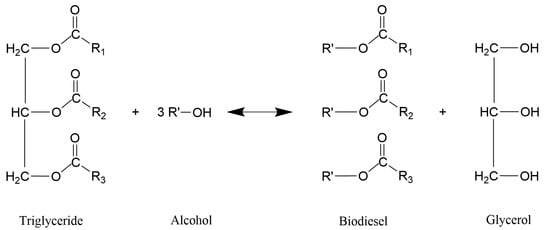 Biodiesel is seen as an environmentally friendly fuel alternative for diesel engines because of its renewable source and low exhaust gas emission compared to fossil fuels [71]. It is normally produced by transesterification between edible oils (e.g., vegetable oil and animal fats) and short-chain alcohols with the aid of a base catalyst (e.g., KOH) (Scheme 6). The use of homogeneous catalysts complicates product separation and catalyst reuse, leading to increased operational costs and high water consumption. One earlier work in using microreactors coupled with heterogeneous catalysts for biodiesel synthesis was demonstrated by Chueluecha et al. [64]. They achieved the efficient transesterification of refined palm oil with methanol over a CaO catalyst packed in a microchannel. The optimum operating conditions (methanol-to-oil ratio = 24:1, 65 °C, ambient pressure) were similar to those in conventional packed bed and batch reactors. However, high-quality biodiesel with a methyl ester content of 96.5% was synthesized under a much shorter residence time (8.9 min in the microreactor vs. 2–8 h in batch). This reaction was further optimized by incorporating isopropanol as a co-solvent with methanol in the same microreactor [19] (Entry 5; Table 2). This resulted in a significantly improved mass transfer rate between oil and methanol. A higher product quality (with a purity of methyl esters of 99%) and reduced methanol consumption (methanol-to-oil ratio = 20:1) were obtained within an even shorter residence time (6.5 min). However, a gradual pressure drop increase in the bed was observed, ascribed to the partial blockage of the microchannel by large particles resulting from coalescence of the formed calcium–glycerine complex during the reaction. To mitigate this blockage, a frequent solvent wash was shown to work (at least partially).