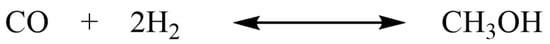 Methanol is considered a promising fuel owing to its high energy density, clean combustion characteristics, and the potential for sustainable production from renewable feedstocks, making it an important candidate in the transition to greener energy solutions [81]. Methanol synthesis from (renewable) syngas is also a cornerstone of the chemical industry due to its wide range of applications in addition to fuels, such as solvent and feedstock for producing other chemicals (Scheme 8). Bakhtiary-Davijany et al. [82] investigated methanol synthesis over a Cu/ZnO/Al2O3 catalyst packed within a multi-slit-type microreactor integrated with a heat exchanger (Entry 4 in Table 4; Figure 2a). They found that the negligible heat transfer resistance in the microreactor facilitated methanol synthesis, which is typically limited by thermodynamic constraints. A near-equilibrium conversion of CO at ca. 60% with methanol selectivity exceeding 98.7% was achieved at 250 °C and 80 bar at a low contact time (approximately 470 ms·gcat/mL). Meanwhile, they claimed that the employed microreactor could improve the mixing performance even under the low Reynolds numbers involved (about 1) [83]. The internal pore diffusion was experimentally shown as neglectable for catalyst particle diameters below 125 μm. The external mass transfer limitation was also excluded under varied operational conditions (235–255 °C and 50–90 bar).