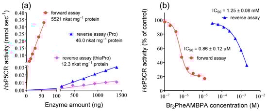 Activity of human P5CR isozyme 1 measured with different assay methods. (a) Increasing concentrations of the purified enzyme were incubated at 37 °C, and activity was followed measuring the P5C-dependent NADH oxidation at neutral pH (forward assay) or the proline (or thiaproline)-dependent NAD+ reduction under alkaline conditions (reverse assay); the resulting catalytic rate is indicated. (b) The effect of increasing concentrations of the enzyme inhibitor 3.5-dibromophenyl-AMBPA [23] was evaluated using the same methods, and results were expressed as percent values of activity in untreated controls; the corresponding IC50 values are shown.