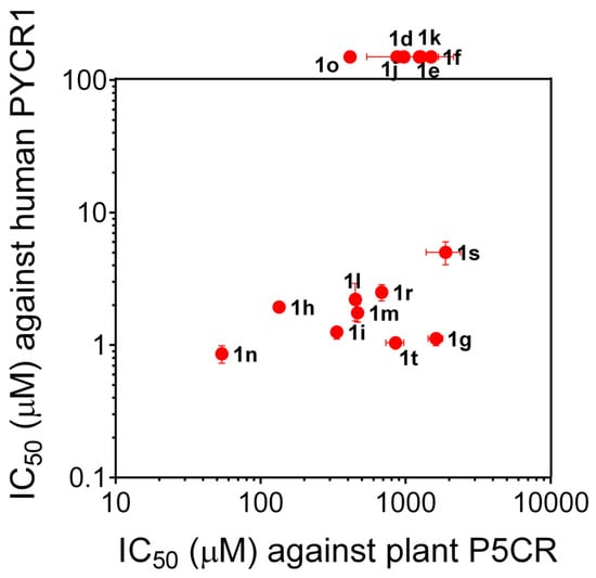 The presence of electron donor groups on the phenyl ring, as in compounds 1d and 1e, appears detrimental. However, this does not seem to be a general rule, since the cyclobutyl (1r) and the cyclopropyl (1s) analogues were among the active substances, although they inhibited PYCR1 to a lesser extent than halogen-substituted variants. The presence of electron-withdrawing groups seems, on the contrary, to enhance the biological activity of AMBPAs. Notwithstanding this, analogues bearing strong electron-withdrawing groups, such as compounds 1q, 1p and 1o, were inactive, and the 3,5-dibromo derivative (1n) was slightly more effective than the dichloro counterpart (1h). Considering the effect of the substituent position, the comparison of the effect of compounds 1f and 1g and that of compounds 1i and 1j (all bearing two chlorines) points at a possible detrimental effect of substitutions in the para position and a beneficial effect of substituent in ortho and mainly meta positions. However, this does not seem to be a general rule, since compounds 1h and 1m were equipotent and the compound 1k was completely inactive. Interestingly, not only AMBPA derivatives were strikingly more effective against the human enzyme than against the plant counterpart, but also their structure–activity relationship was significantly different. As shown in Figure 2, some of the tested compounds that herein resulted among the most active inhibitors (such as compounds 1r, 1s and 1t) had been previously found scarcely active or substantially ineffective against P5CR from Arabidopsis thaliana [44,45] or vice versa (as in the case of the compound 1o).