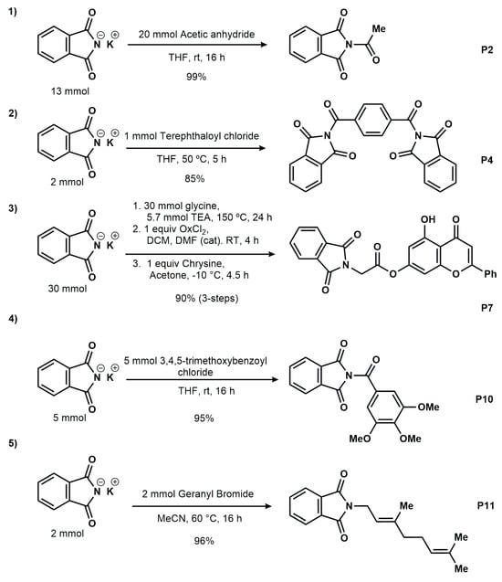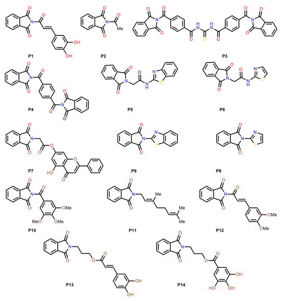 All fourteen derivatives P1–P14 are shown in Figure 1 and its corresponding names are listed here: P1: (E)-2-(3-(3,4-dihydroxyphenyl)acryloyl)isoindoline-1,3-dione, P2: 2-acetylisoindoline-1,3-dione, P3: N,N′-thiocarbonylbis(4-(1,3-dioxoisoindoline-2-carbonyl)benzamide), P4: 2,2′-terephthaloylbis(isoindoline-1,3-dione), P5: N-(benzo[d]thiazol-2-yl)-2-(1,3-dioxoisoindolin-2-yl)acetamide P6: 2-(1,3-dioxoisoindolin-2-yl)-N-(thiazol-2-yl)acetamide, P7: 5-hydroxy-4-oxo-2-phenyl-4H-chromen-7-yl 2-(1,3-dioxoisoindolin-2-yl)acetate, P8: 2-(benzo[d]thiazol-2-yl)isoindoline-1,3-dione, P9: 2-(thiazol-2-yl)isoindoline-1,3-dione, P10: 2-(3,4,5-trimethoxybenzoyl)isoindoline-1,3-dione, P11: (E)-2-(3,7-dimethylocta-2,6-dien-1-yl)isoindoline-1,3-dione, P12: (E)-2-(3-(3,4-dimethoxyphenyl)acryloyl)isoindoline-1,3-dione, P13: 3-(1,3-dioxoisoindolin-2-yl)propyl (E)-3-(3,4-dihydroxyphenyl)acrylate and P14: 3-(1,3-dioxoisoindolin-2-yl)propyl 3,4,5-trihydroxybenzoate. The 1H and 13C NMR spectra of the synthetized compounds P2, P4, P7, P10, and P11 were recorded on a Bruker Ascend 400 MHz NMR spectrometer. 1H NMR measurements in DMSO-d6 were carried out at the operating frequency of 402.64 MHz, and the 13C NMR spectra were recorded at the operating frequency of 101.25 MHz. All spectra were locked to the deuterium resonance of DMSO. Supplementary Materials include the 1H and 13C NMR spectra. The FT-IR spectra of P2, P4, P7, P10, and P11 in the mid-infrared region were recorded using ATR on an Agilent Technologies Cary 600 series FT-IR spectrophotometer. Elemental analysis measurements were recorded on a FlashSmart elemental analyzed (Thermo Fisher Scientific, Walthma, MA, USA).