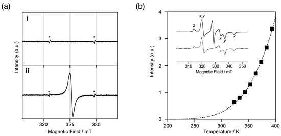 (a) ESR spectra of [1•+][NTf2−] in (i) the solid (at 50 °C (323 K); microwave frequency = 9.1403 GHz) and (ii) the liquid (at 150 °C (423 K); microwave frequency = 9.1403 GHz). The asterisks denote signals assigned to Mn2+ marker. (b) Temperature-dependent relative intensities (filled square) of the ESR spectra for [1•+][NTf2−] in the solid sample assigned to the thermally excited triplet species. The broken line represents the simulated curve calculated using the singlet–triplet model with −3.55(6) × 103 K. Inset: observed (at 80 °C (353 K), solid line; microwave frequency = 9.2097 GHz) and simulated (broken line) ESR spectra of the spin-allowed transition for [1•+][NTf2−] in the solid state. Assignments of the canonical orientations are denoted by x, y, and z. The signal at 330 mT originated from the spin-doublet species. The parameters for simulations are as follows; gxx = 2.018, gyy = 2.003, gzz = 2.003, |D/hc| = 0.0140 cm−1, and |E/hc| = 0.000384 cm−1.