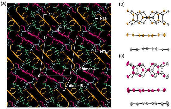 (a) Perspective view of the packing of [1•+][NTf2−] in the crystal structure along the a-axis. Two types of crystallographically independent 1•+ and NTf2− units are shown in orange and reddish-purple, light green and light blue, respectively. (b,c) ORTEP views of the stacking modes of (b) dimer-A and (c) dimer-B, respectively. The gray molecular units are located behind the front ones, which are denoted by the colors.