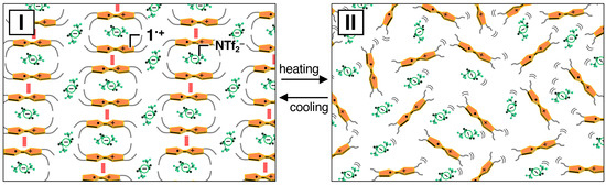 The changes in the physical properties of [1•+][NTf2−] can be explained by the following proposed mechanism (Figure 6). In the initial green solid state, 1•+ species form the diamagnetic π-dimer units (Figure 6I). The formation of the π-dimer structure is clearly evidenced by the results of single-crystal structure analysis and further supported by the observation of thermally excited triplet species in the ESR spectra. Upon heating above 144 °C (417 K), compound [1•+][NTf2−] transforms into the brown liquid state. In this ionic liquid state, compound [1•+][NTf2−] exhibits a paramagnetic property due to the presence of 1•+ monomers, as confirmed by measurements of the ESR spectra (Figure 6II). The electronic spectrum of [1•+][NTf2−] in the liquid state closely resembles that in solution, strongly suggesting the dissociation of the π-dimer structures. Cooling below 115 °C triggers the liquid–solid phase transition, inducing the association of monomers into the diamagnetic π-dimer units (Figure 6I). These results suggest that NTf2− ions, with high conformational flexibility, influence the dissociation and association behavior of 1•+ species in response to temperature changes.