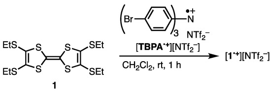 All reactions were performed under inert atmosphere. Tetrakis(ethylthio)tetrathiafulvalene, dehydrated dichloromethane (CH2Cl2), dehydrated diethyl ether (Et2O), and dehydrated cyclohexane were obtained from common commercial suppliers and used without further purification. Tris(4-bromophenyl)aminium bis(trifluoromthanesulfonyl)imide ([TBPA•+][NTf2−]) was prepared according to the literature [56].
