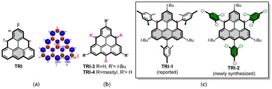 Graphene fragments with triangular shapes ([n]triangulenes) [1,2,3,4], characterized by three zigzag edges [5,6,7], naturally host one or more unpaired electrons, resulting in a high-spin ground state by default [8,9,10,11,12,13,14]. These molecules have garnered significant attention in recent years due to their potential applications in high-spin organic ferromagnets, spintronics, molecular electronics, and catalysis, as well as their importance in fundamental research [15,16,17,18,19,20]. Despite these interests, the synthetic chemistry of [n]triangulenes remains both a resurgent focus and a persistent challenge since Eric Clar’s pioneering efforts to synthesize [3]triangulenes in the 1950s [21,22,23]. The inherent instability caused by their unpaired electrons complicates their synthesis and isolation, as these species are highly reactive [24,25,26,27,28,29,30,31,32]. For instance, the spin density in [3]triangulene is predominantly concentrated along the zigzag edges (Figure 1a, α- and γ-positions), which significantly contributes to its reactivity [33]. Consequently, both pristine and (partially) substituted forms of [3]triangulenes are susceptible to oxidation, dimerization, and polymerization [11,32,33,34,35].