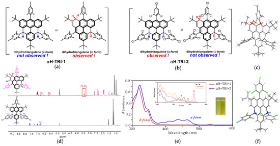 A previous study by Juríček et al. showed that the dihydro-triangulene precursor possessed two isomers, i.e., the a form, where the two hydrogen atoms are located at the γ-carbons, and the b form, wherein a rearrangement occurs and the hydrogen atoms are positioned at the α-carbons [37]. Interestingly, in contrast to the previous report, the mesityl-substituted dihydro-triangulene αH-TRI-1 was found to exist as a sole b-form isomer (Figure 2a). Specifically, in contrast to the complicated NMR spectrum showing two sets of signals corresponding to a mixture of two isomers reported by Juríček et al., the NMR spectrum of αH-TRI-1 displayed a set of distinct and well-resolved peaks, including the methylene protons of the α-carbon, which could be assigned to a single b-form isomer (Figure 2d). In addition, as shown in Figure 2e, the UV-vis absorption spectra of αH-TRI-1 exhibited the characteristic absorption peaks of the b form (300–350 nm), without the finger peaks of the anthracene fragment (400–500 nm). Finally, the structure of αH-TRI-1 was unambiguously confirmed by X-ray crystallographic analysis, clearly revealing the presence of two methylene groups at the α-carbon positions (red color) (Figure 2c and Figure S2). More interestingly, when the γ-positions were substituted with 2,4,6-trichlorophenyl groups, the dihydro-triangulene αH-TRI-2 existed as an a-form isomer, which was also well characterized (Figure 2b). In particular, the NMR spectrum of αH-TRI-2 exhibited high symmetry in the aromatic region, with distinct peaks corresponding to seven types of hydrogen and the absence of the hydrogen of the methylene group at the α-positions (Figure 2d). In addition, the UV-vis absorption of αH-TRI-2 showed the characteristic vibronic progression of anthracene subunits, indicating that the electronic structure of the a form was preserved (Figure 2e). Eventually, the structure of αH-TRI-2 was unequivocally confirmed by X-ray crystallographic analysis, wherein two hydrogen atoms were located at the γ-carbon position of the triangulene fragment (blue color) (Figure 2f). This interesting substituent-dependent isomerization may be ascribed to the distinct electron-rich and electron-deficient nature of two substituents. The mesityl-substituted a-form isomer may be vulnerable to oxidation due to the electron-rich character of the mesityl groups, facilitating the rearrangement during the ring closure process to generate the b form. By contrast, the electron-deficient substituent 2,4,6-trichlorophenyl could stabilize the a-form isomer of the dihydro-triangulene precursor.