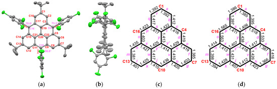 X-ray crystallographic structure of TRI-2 in top view (a) and side view (b). The bond length (Å) of the triangulene backbone for TRI-2 (c) and αH-TRI-2 (d) with labeling.