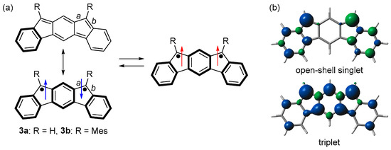 (a) Resonance structures of 3. Arrows indicate electron spin (blue and red colors are for singlet and triplet diradicals, respectively). (b) Spin densities of open-shell singlet and triplet states of 3a. Blue and green surfaces represent α and β spin densities, respectively.